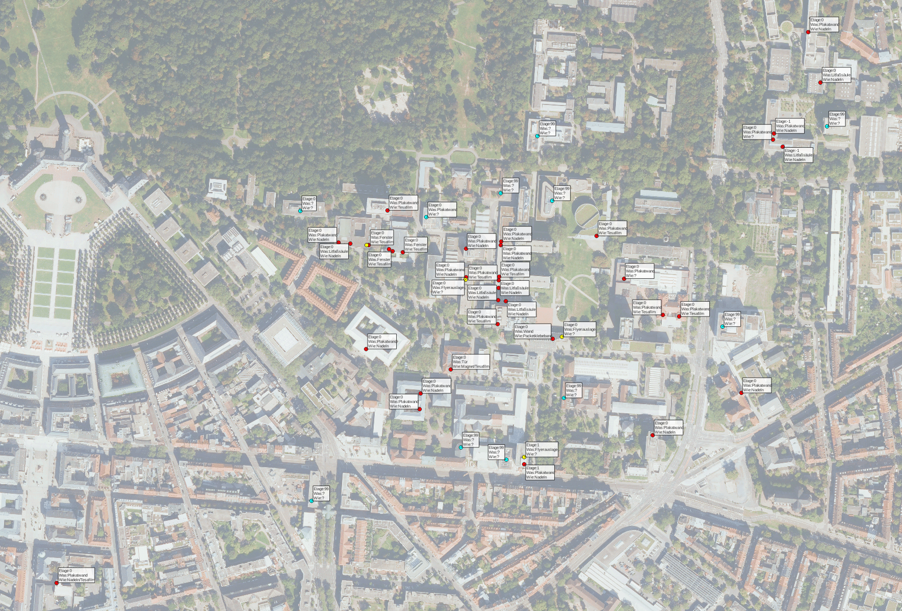 Unvollständige Übersicht über Plakatiermöglichkeiten (Plakatwände o.ä.) innerhalb von Gebäuden. Hier solltet ihr ausreichend Reißzwecken und Tesafilm mit euch führen. Außerdem sind auch einige Flyerauslagen eingetragen.